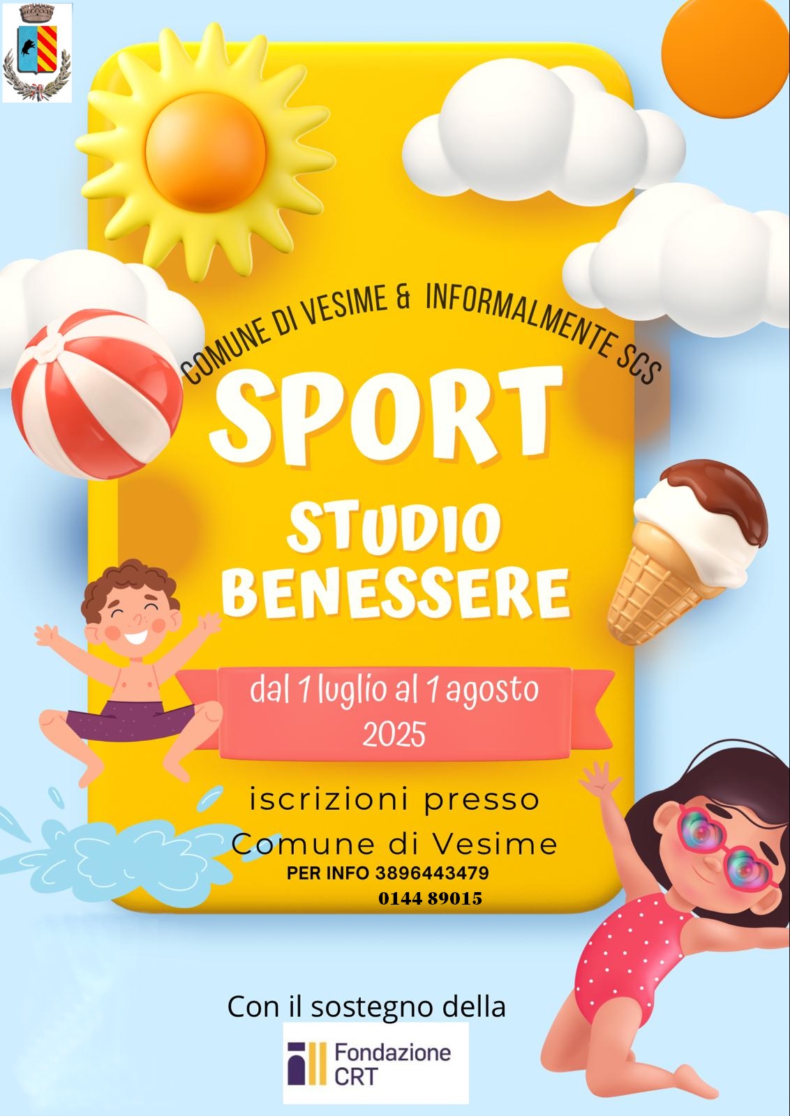 Nell'ambito del progetto "Sport, studio e benessere", sostenuto dalla Fondazione CRT, sono avviate le attività estive presso il complesso sportivo della piscina di Vesime. Le attività, organizzate settimanalmente, saranno realizzate dal 1 luglio al 1 agosto.